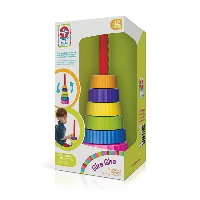 Com rodinhas em diferentes tamanhos, cores vivas e vibrantes, a criança encaixa uma por uma na haste principal e acompanha o movimento delas girando até chegarem no final da base.