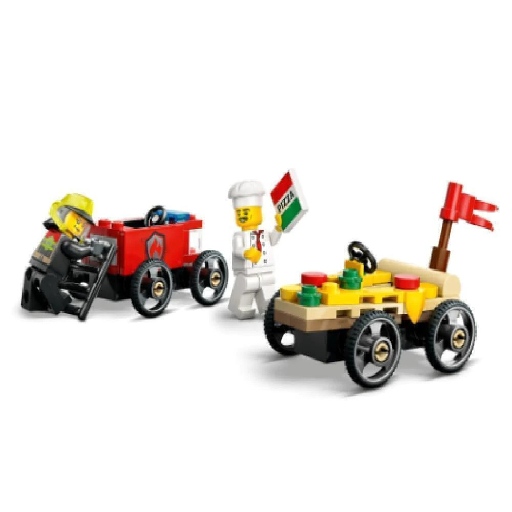 O brinquedo de carro de corrida em formato de pizza neste conjunto de 70 peças mede mais de 5 cm de altura, 9 cm de comprimento e 4 cm de largura.