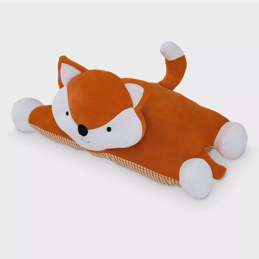 Boneco estilo travesseiro que dobrado e fixado com velcro forma uma raposa gracinha chamada Fubá em pelúcia/plush macia de algodão antialérgico com cabeça e patas em pelúcia na cor laranja e focinho com detalhes bordados nas cores preto e branco.