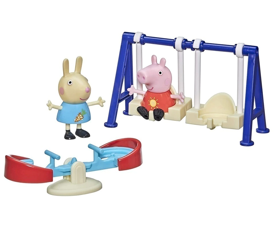 O brinquedo No Parque com a Peppa inclui figuras da Peppa Pig e sua amiga Rebecca Coelho, além de acessórios de balanço e gangorra. As crianças a partir dos 3 anos podem recriar suas cenas favoritas da série ou criar novas histórias inspiradas na série Peppa Pig. Os acessórios de balanço e gangorra são ideais para muitas brincadeiras! Figuras fáceis de limpar.
